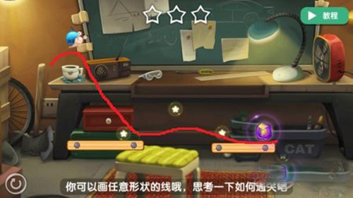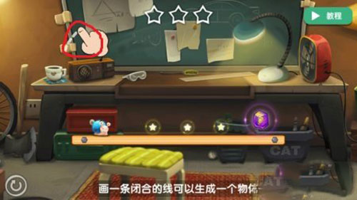 这一关中,需要画出一个闭合的物体,使其大力撞击蜗牛,使其滚动,在图上手的位置花圆圈即可。