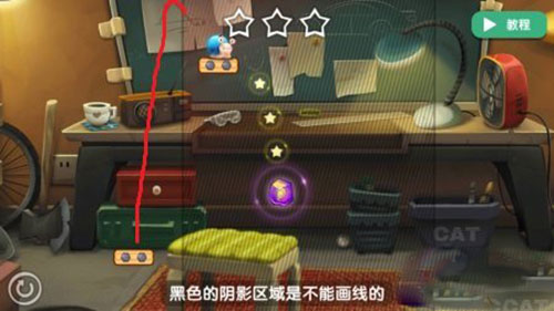 这一关卡中黑色区域是不可以画线的,所以我们要画出一条线,使其撞击到蜗牛滚动起来,如图下红色所示。