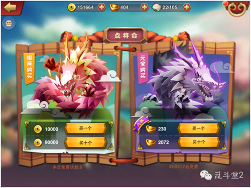 b. 有钱能使鬼推磨,通过在“点将台”花费银两或者元宝抽奖获得。银两只能获得星级比较低的武将,高级的武将自持身份,要用元宝勾引,所以——元宝十连抽,必须的!如果抽到已有的武将,会自动转换成碎片,用于武将的升星使用,星级越高,武将的属性越好。