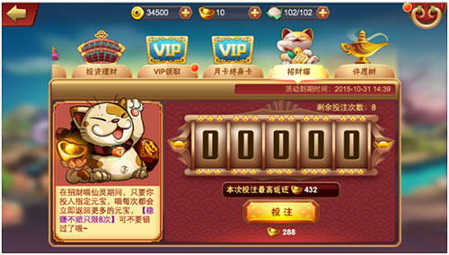 开服的前3日还有“疯狂的招财猫”活动,玩家只需下注指定数额的元宝,系统必定返还“更多元宝”,稳赚不赔!