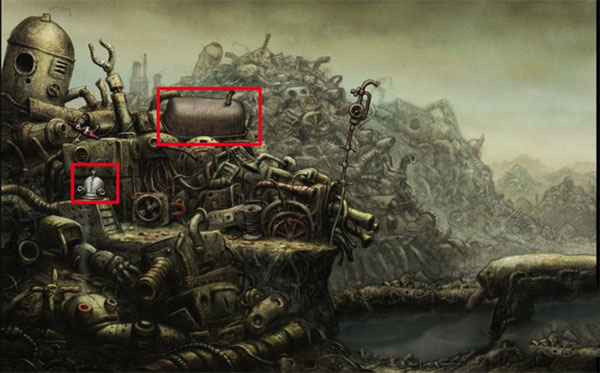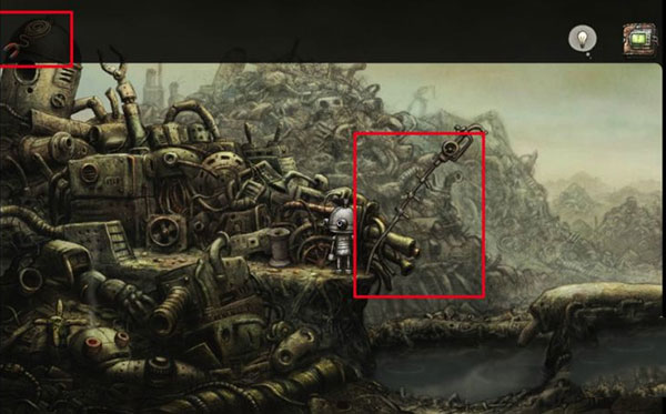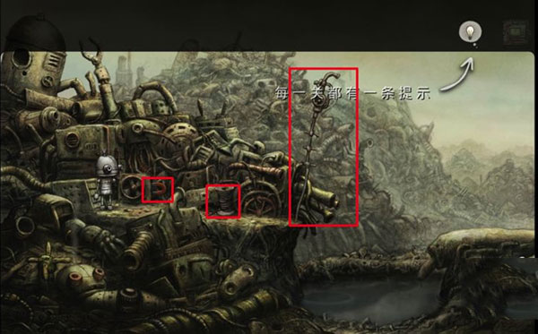 1、打开机械迷城游戏后,可以看到一些介绍,点击图中标红的位置,上面那个盒子下面会出现机器人的身子,左下角是机器人的头,他们会组合成一个机器人;