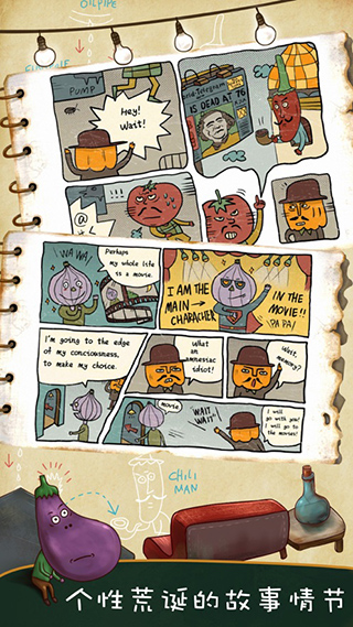 带着两撇小胡子的南瓜先生,随着他的历险,勾勒出了一个荒诞的蔬菜王国世界。随处可见的一些小谜题或者提示,都可以看出制作人的匠心独运,这个荒诞的世界的秘密,等着玩家去细细发掘。