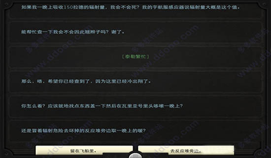 按道理来说,泰勒作为一个学霸理科生,在常识性甚至学术性的知识方面理应比玩家强,然而泰勒说的话给人感觉这是一个不能自理,胆小怕事的人。很多事情,他都会通过让你来决定,例如“我睡在冷冷的仓库里,还是睡在反应堆附近,冒着辐射的危险来取暖”,然而他自己知道辐射反应堆的照射剂量在 150rad 左右,没可能不知道对人体的影响吧,但他却胆小得让你帮他查资料,以确认 150rad 的辐射不会对他的生命造成威胁,感觉这是他在出难题来考验你一样。