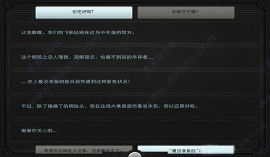 另外,游戏还有一个亮点,就是真实性。在泰勒向我发起“我该去坠毁点,还是去山峰”的疑问时,我选择了坠毁点,让他去飞船的残骸上寻找更多的生还者。他采纳了我的建议,并按照我所说的去做,而故事也按照我的思路发展。他说它要离开一个小时,一开始我以为只是稍等片刻,结果真的过去了一个小时,他才再次回复我。由于游戏时耗与现实相当,所以让人倍感真实。