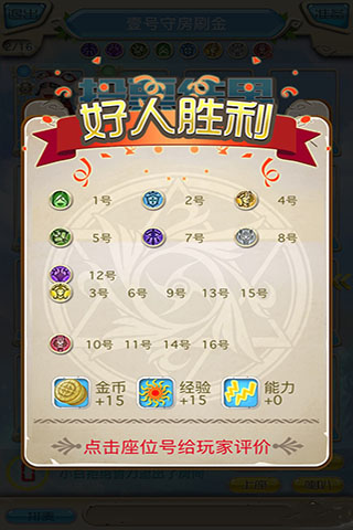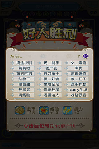 每把游戏结束后会弹出一个身份牌界面,如果您想要贴标签,这时候一定不要关闭它。点击界面下方的“点击座位号给玩家评价”。