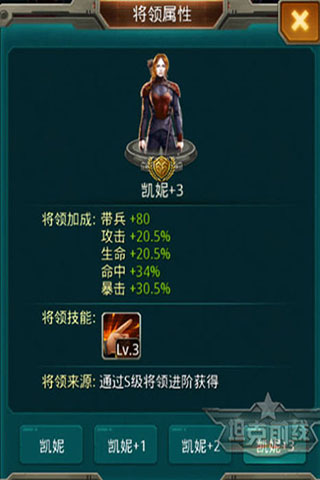 再此告诉大家一点点合成将领的小心得,拿凯妮举一个例子。凯妮:增加带兵数+攻击+命中+暴力(在合成的时候大家尽量的去选择一些加攻击+命中+暴击的S将领来合成凯妮,这样会为大家增加成功率)