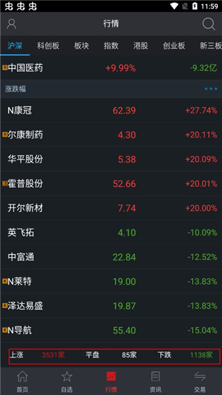 4、在“行情”中可以对上涨、平盘、下跌进行了解;