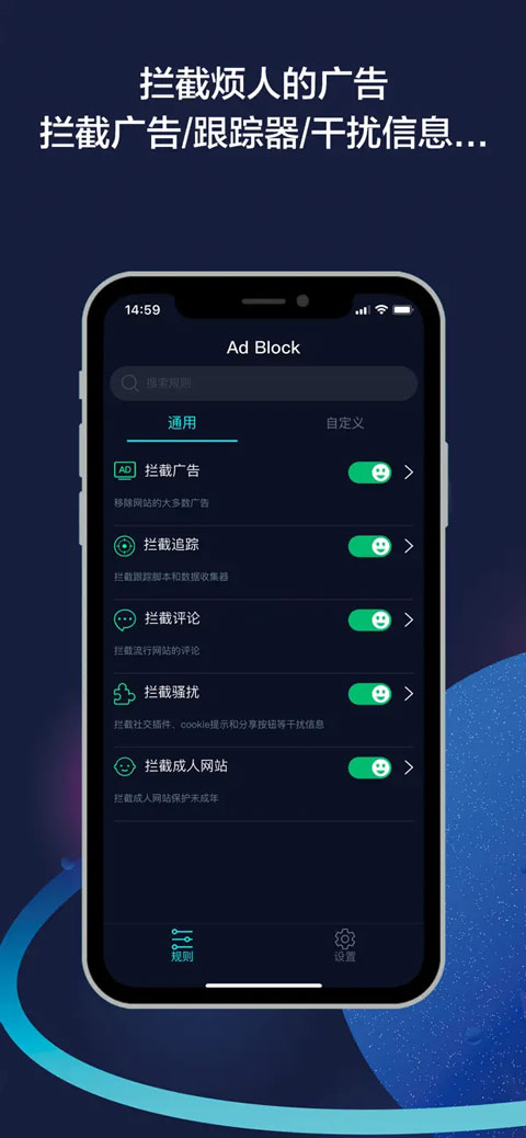 1、拦截广告 - 在Safari中删除各种广告。告别烦人的横幅,弹出窗口和视频广告。