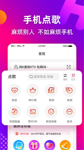 2、无线点歌、音准评分、用手机点歌做麦霸潮人;