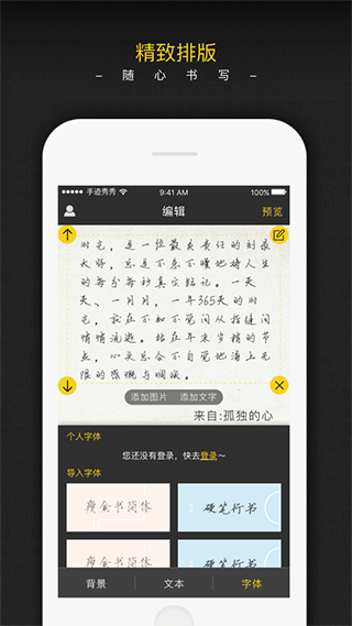手迹秀秀ios版是方正手迹科技旗下打造推出的一款优质字体图文编辑软件,该软件以官方优质的文本字体资源为基础,结合时下用户日常生活记录分享需求,汇集海量字体、图片、滤镜及挂件多种素材于一体,可让用户根据自身喜好,随意图文混排编辑,换背景、换字体,加滤镜、加挂件,无论是简短便签、还是精美长文都能一键生成高清图片,分享到微信、微博等主流社交平台,与亲朋好友分享互动。