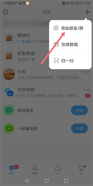 2、在弹出的下拉菜单里点击“添加朋友/群”