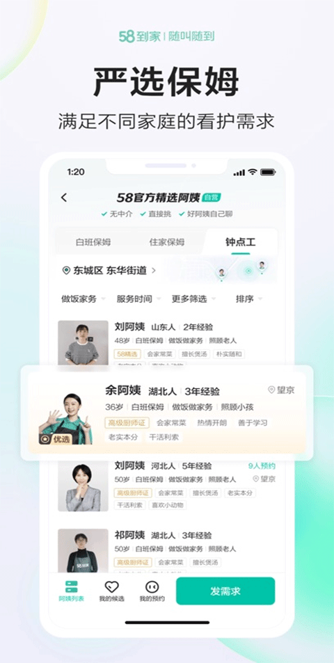 58到家家政苹果版是由58同城旗下58到家官方发布的一款家政服务软件,它拥有非常丰富的家政阿姨资源,涵盖了北京、上海、杭州、西安、深圳等多个城市,让服务更加方便灵活。58家政支持家政阿姨身份认证,严格审核健康证和相关工作技能,让用户放心寻找服务,有需求的朋友请下载体验。
