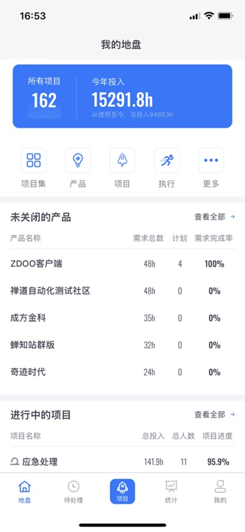 直观展示项目进度与Bug概况,快速筛选个人参与或活动中的项目,深入查看执行、需求、Bug、用例、文档、版本等详细信息,确保项目透明化管理。