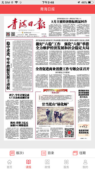 2、读报:提供每天的青海日报电子版内容,字体更放大,阅读更舒适。