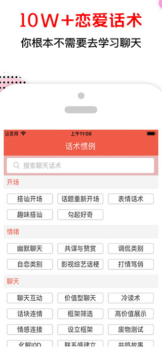 恋爱话术ios是一款专门针对异性聊天开发的社交应用软件,解救您的尬聊场面,让妹子爱上和你聊天。不会聊天?经常尬聊?软件内置10W+恋爱话术,你根本不需要学习去聊天,当您遇到不知从何说起时,搜一搜,N+精彩回复任你选,在这里,有问必答,让导师和兄弟们一起为你出谋划策,很适合当下那些想恋爱又不知道怎么表达的人,可以学到说话的技巧。恋爱话术,你的尬聊救星!