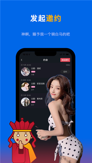 约吗ios版是一款最火爆的约会交友APP,该平台云集来自全国各地的高颜值美女主播加盟入驻,萌妹,傲娇,清纯,御姐,女神各种类型一应俱全,用户可根据喜好一键关注心仪主播,第一时间了解最新动态发布,通过点赞、评论、送花送礼物等多种方式与主播互动,一对一私聊。同时还可以快速结交志趣相投的好友,录制各类有趣好玩的短视频,分享生活中的点点滴滴,秀出自己的自信与魅力,坐拥粉丝的拥戴,欢迎下载使用~