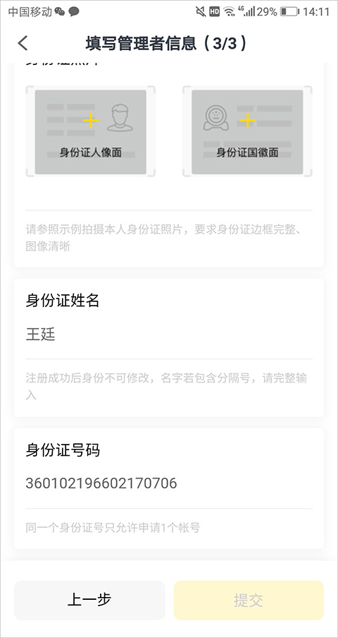 5、填写完毕后点击【下一步】,然后在打开的新页面中,上传身份证,输入身份证上的真实姓名,以及身份证号,联系电话,手机验证码等