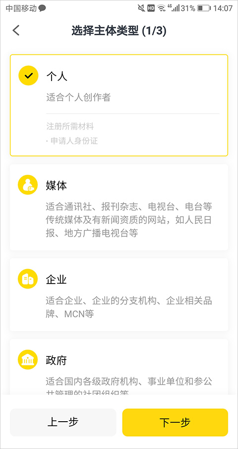 3、授权之后,会打开如下的新页面,用户可以选择身份进行注册,目前软件可提供个人、媒体、企业、政府、其它组织进行注册使用,这里以个人身份进行注册为例子