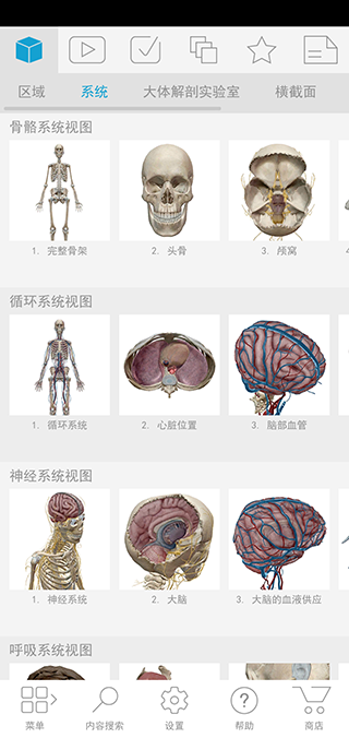 视图页将人体构造分为人体区域、人体系统、横截面、显微解剖和肌肉动作五项,每一项都有详尽的细分,呈现 3D 人体构造模型。