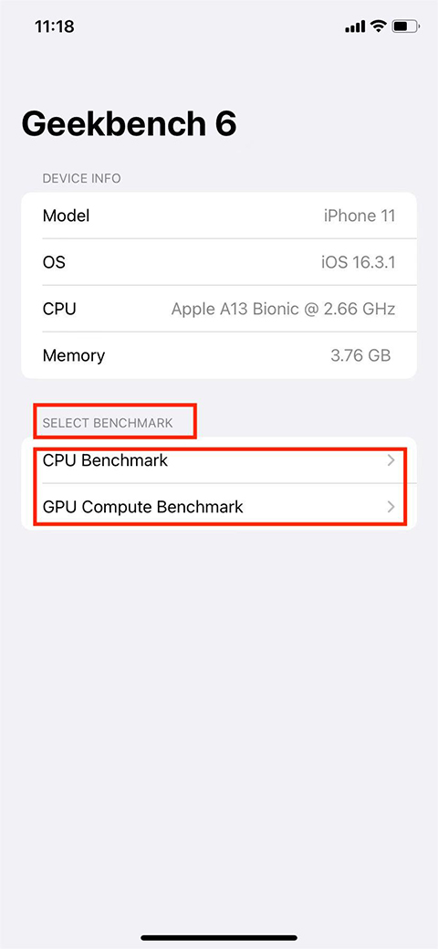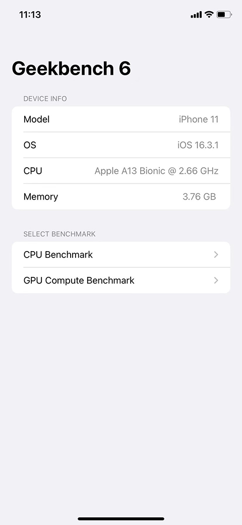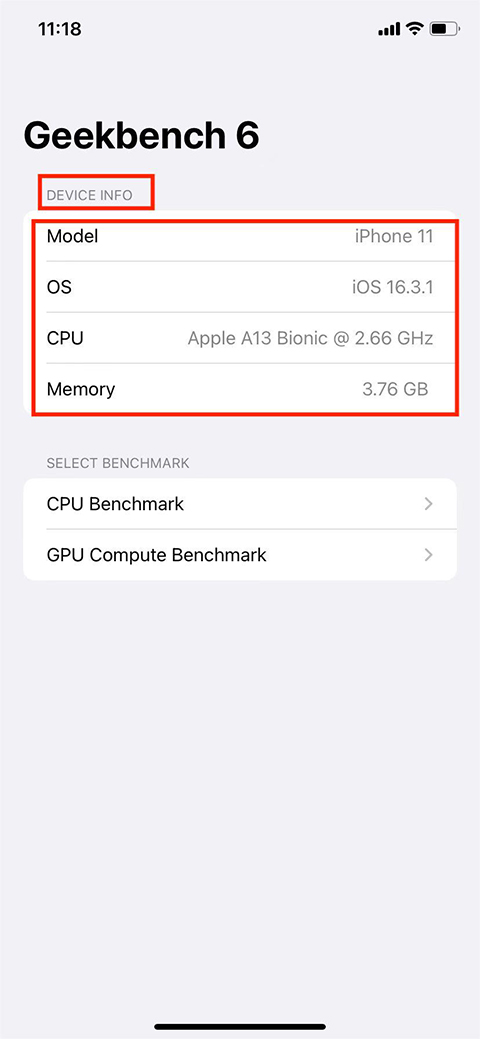 1、打开苹果Geekbench6,进入主界面,可看到分为【device info】设备信息栏目,包括当前设备的【Model】型号、【OS】系统、【CPU】处理器以及【Memory】内存等参数,