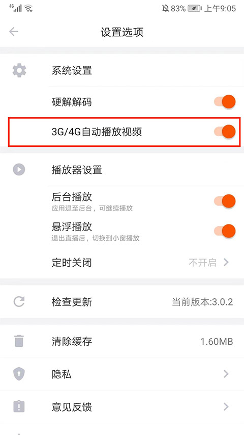 3、进入设置选项后点击“3G/4G自动播放视频”后面的圆点,