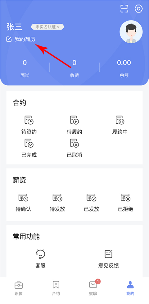 1、首先进入软件,在我的页面点击上方编辑简历