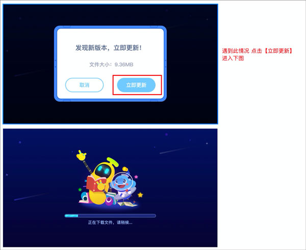 1、打开小盒课堂,当遇到页面弹出“发现新版本,立即更新!”提示,点击立即更新。