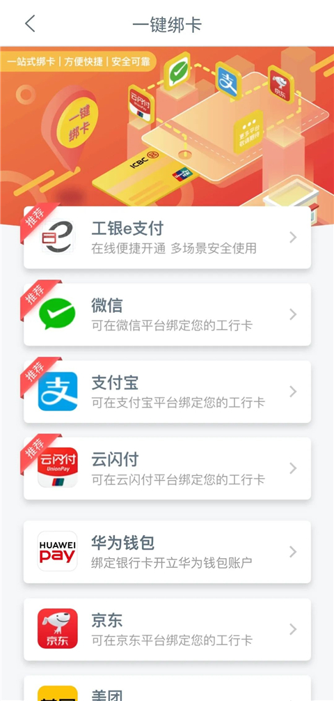 3、卡启完成后,您如果需要开通工银e支付、微信、支付宝、京东、美团等支付功能,可以点击“一键绑卡”。