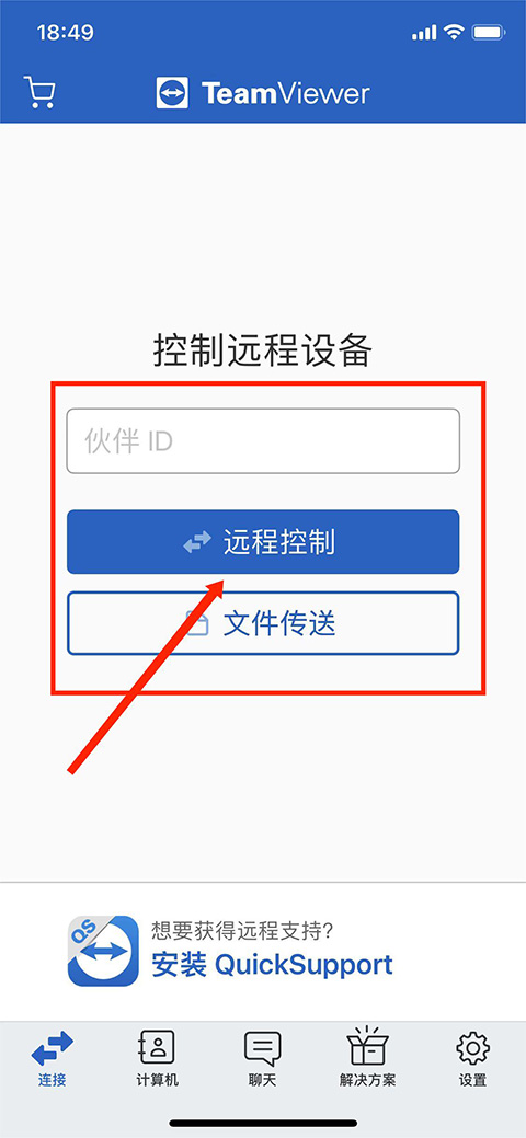 2、打开苹果手机teamviewer,在伙伴ID界面输入伙伴ID后,选择“远程控制”选项,