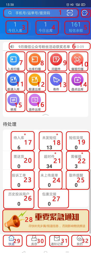(1) 顶部搜索框:可通过提货码/运单号/手机号/手机号后四位进行最长6个月内的包裹状态查询、并可操作标记标签、登记问题件、出库、拍照出库、打印提货码等操作;也可用右侧扫描框扫描识别运单号进行操作。