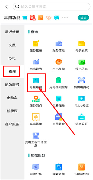 2、在“更多”页面我们可以看到所有的用电服务,如交费、办电、查询、能效服务、电动车、新能源等等服务分类,点击“查询”然后再找到“电量电费”点击进入;