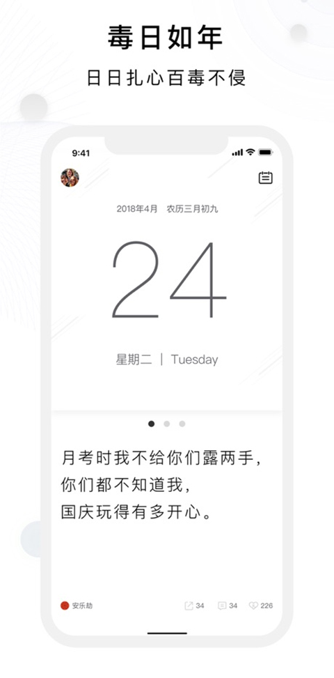 毒汤日历苹果版是由上海硕道信息技术有限公司开发的一款社区资讯日历软件,软件特有的“毒”打卡功能让用户在月历上选择以后的日期,设置一个小目标,立一个Flag,然后每天坚持你的打卡记录扎心每一天。软件除了包含了万年历,农历和放假安排等日历功能外,还特设了社区分享资讯,用户可以在软件上分享自己的打卡经历,记下生活的感悟,让大家都来看看你的坚持成果。同时你也能在毒汤日历上分享你自己创作的文章,文章还支持好友点赞,评论,转发等趣味互动功能,因此你完全可以把它当成一个备忘录、记事本、倒数日工具甚至是盆友圈。