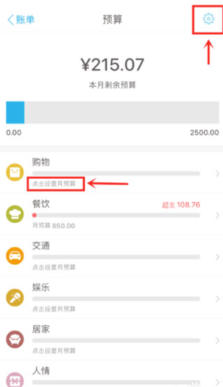 2、预算内分为“总预算剩余”和“分类预算剩余”,右上角“?”可进行预算设置,下方的分类预算也可进行设置。