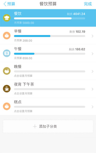 比如“餐饮”分类,记账选项里的“早餐”、“午餐”等都可添加进子分类,一同归于餐饮预算。