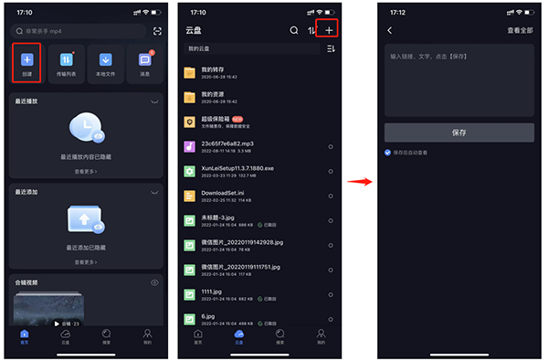 点击“首页”---“创建”或点击“云盘”---“+”,即可将本地文件保存至云盘或将资源添加至云笔记下载