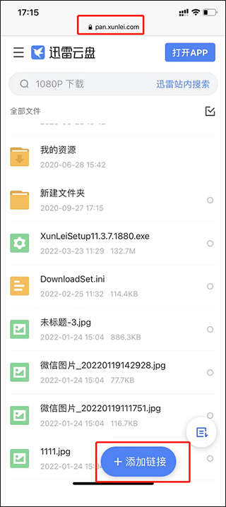在浏览器中打开pan.xunlei.com,登录后点击“+添加链接”,添加资源即可