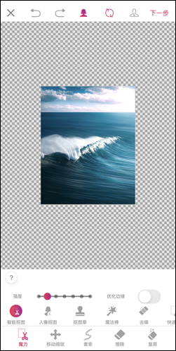 5、在添加完前景图片后,我们点击其右上角的剪刀形状按钮,对此图片进行抠图处理(不需要可跳过)。