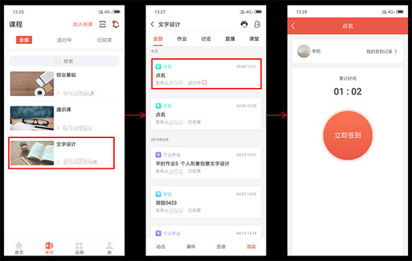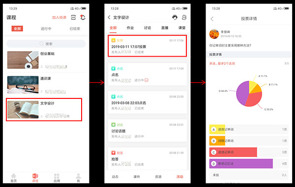 4、点击相应课程,在【动态】中可以找到老师最新发布的课堂互动,或者点击【活动】,查看并参与老师发起的点名、投票、抢答。