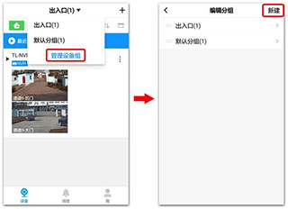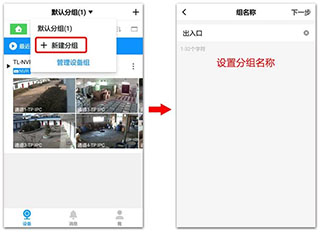 登录TP-LINK安防APP后,点击顶部『默认分组>新建分组』,并设置一个分组名称: