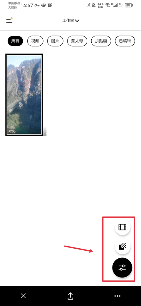 2、视频导入后,选中视频并点击右下角编辑按钮,或者使用蒙太奇功能