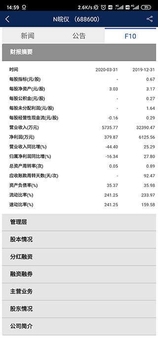 3、然后就能看到这只股票的数据了,可以分为分时、日k、周k、月k等趋势,并且在下面还能看到这只股票的新闻、公告、f10: