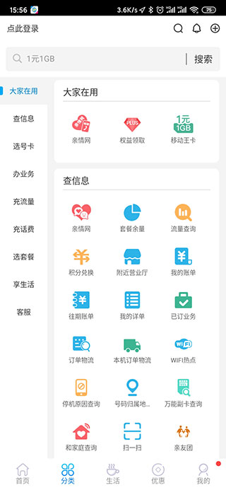 3、在分类中,总共分为大家在用、查信息、选号卡、办业务、充流量、充话费、选套餐、享生活、客服等: