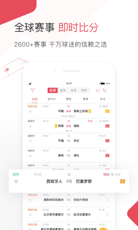 足球篮球网球比分实时更新,无需守在视频直播前,即可快速了解多场足球篮球比赛的实时赛况、比赛结果等信息。