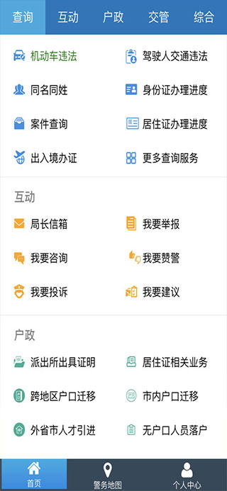 3、点击首页可以看到机动车违法、案件查询、出入境办证、身份证办理进度、同名同姓等功能: