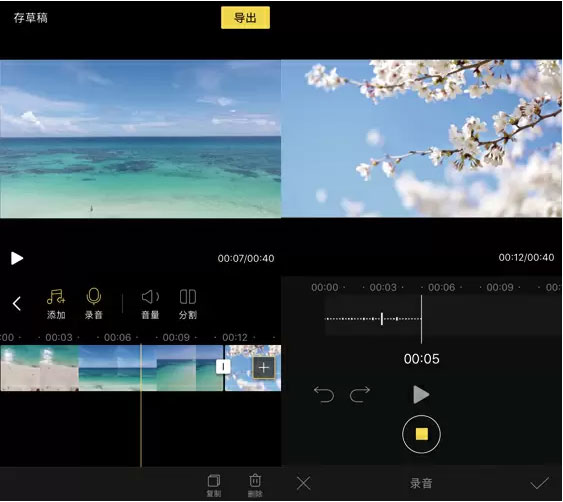 点击添加音乐,可以直接添加本机已有的音乐素材也可以为此段视频实时录音。用户可以根据提示将音乐导入,而安卓用户则可以直接读取本地所有音乐素材。添加好以后可以调整音频的音量,并且进行分割删除不需要的部分。