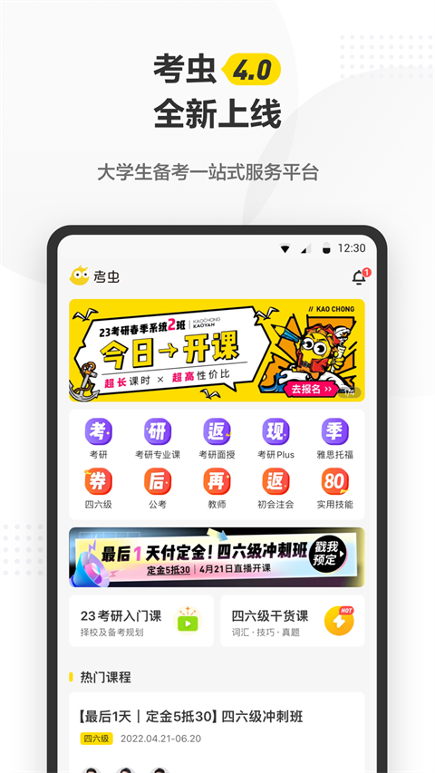 考虫苹果版是由北京多知科技有限公司专为大学生考研而开发的一款高效的英语学习软件,同时该软件已成为四六级和考研英语培训领域的标杆产品,这里不仅提供了海量大学四六级考试、考研英语考试、雅思考试的精选课程,还为用户提供了在线模拟考试、随堂测试和能力评估报告、课后答疑等,从而能让你随时了解自己目前的学习状态,让用户可以获得更好的英语学习体验。除此之外,在考虫苹果版中你不但能轻松通过直播的方式来学习到各种英语小知识,而且还能让你在这里享受到最正式最真实的模拟考场听力,并其中还有各种名师在线为你指导,这对于想要提高英语水平的朋友来说这款软件值得一用,有需要的可免费下载体验。