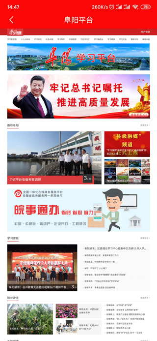 今日阜阳苹果版是由阜阳市电视台打造的一款能够紧贴本地域居民信息服务需求的信息服务平台,可以为用户带来海量,且丰富的当地新闻和新鲜事。同时软件中还添加了本地要闻、金融资讯、随手拍、爆料、学习强国、我和联华、阜阳平台、电视频道、推送阅读、广播、直播等众多服务功能,可轻松让用户在第一时间先了解到所有关于本地的各种方面信息,以及实时查看我国最新的当政信息,非常实用,是每一位阜阳市居民的必备软件。