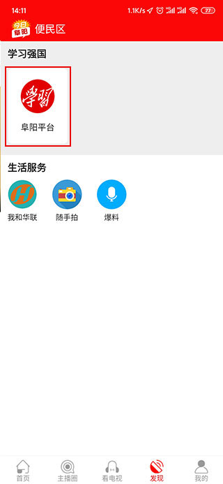 2、然后会看到首页、主播圈、看电视、发现、我的五个板块,打开发现板块:
