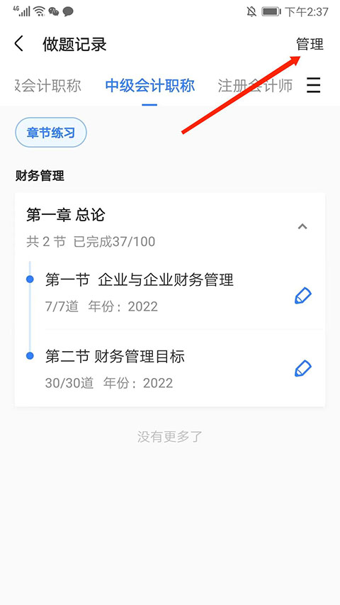 3、进入到做题记录界面,然后选择右上角“管理”选项,