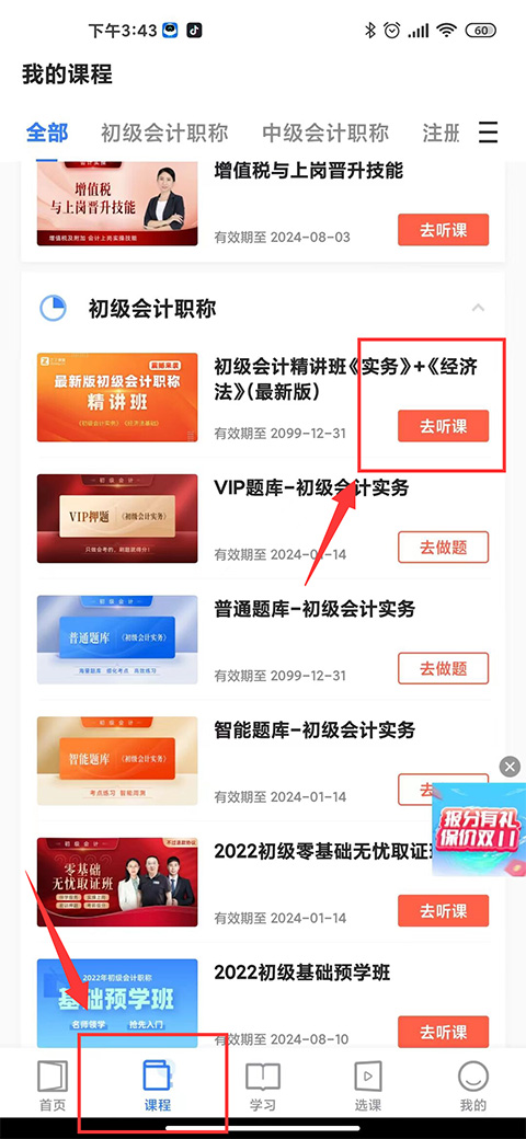 2、如果已经激活了课程,就可以直接点击【去听课】,根据提示选择你准备学习的章节进行学习即可,